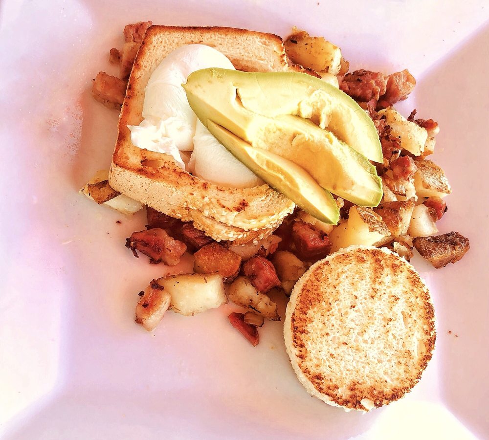 Fresh Avocado with sea salt, olive oil, gluten free toast, sliced tomato, two eggs poached