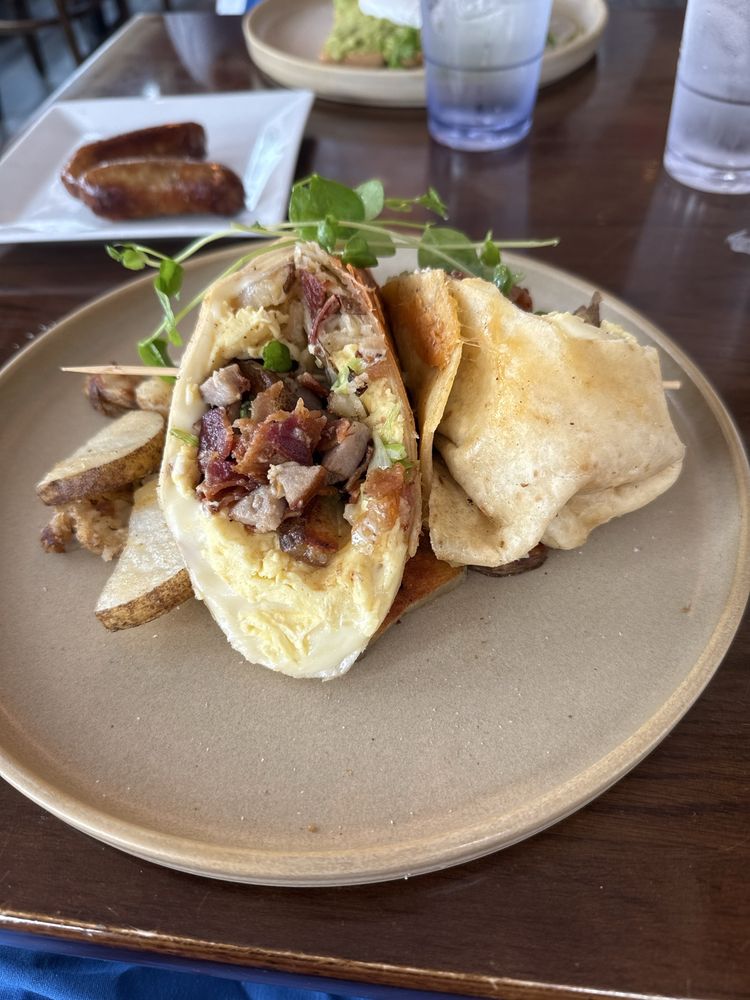 bacon, pork roll, sausage, cripsy potato, cheddar, scrambled egg, peppers, onionwrapped in tortilla, side of home fries